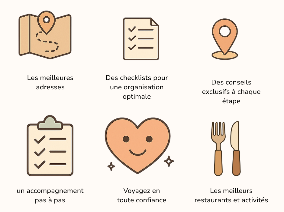 À l'intérieur, vous trouverez des itinéraires détaillés, des rappels spirituels, des listes de contrôle, des conseils logistiques et des astuces de voyage essentielles pour vous aider à rester organisé et concentré.