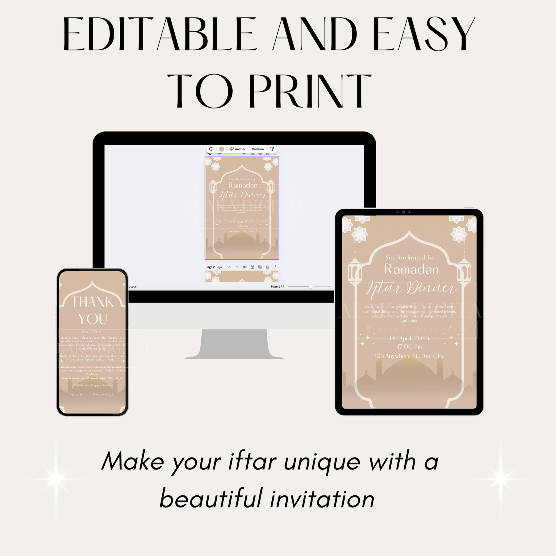 Rendez votre rassemblement du Ramadan inoubliable avec nos modèles Canva entièrement personnalisables . Honorez vos invités avec une invitation élégante et impressionnez-les avec des cartes de remerciement assorties qui reflètent l'attention et le soin que vous avez apportés à chaque détail. Personnalisez facilement chaque modèle pour qu'il corresponde à votre style et à votre thème pour une célébration vraiment mémorable.
