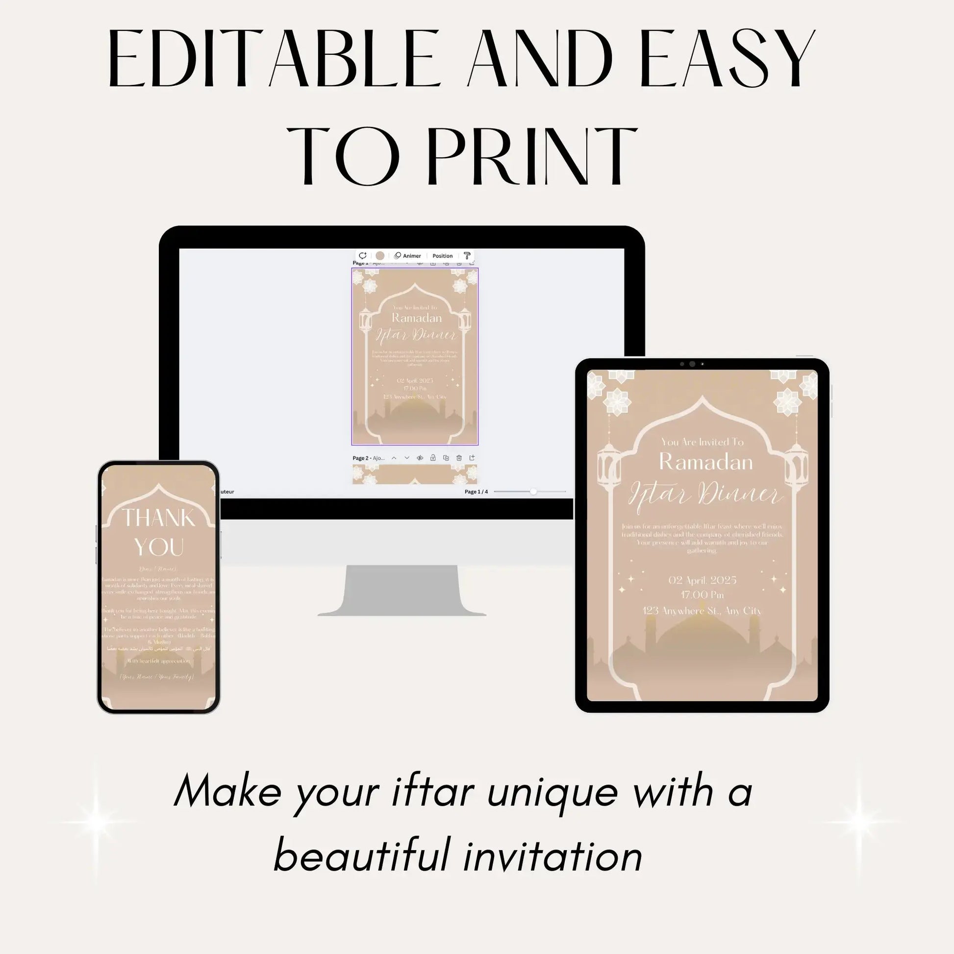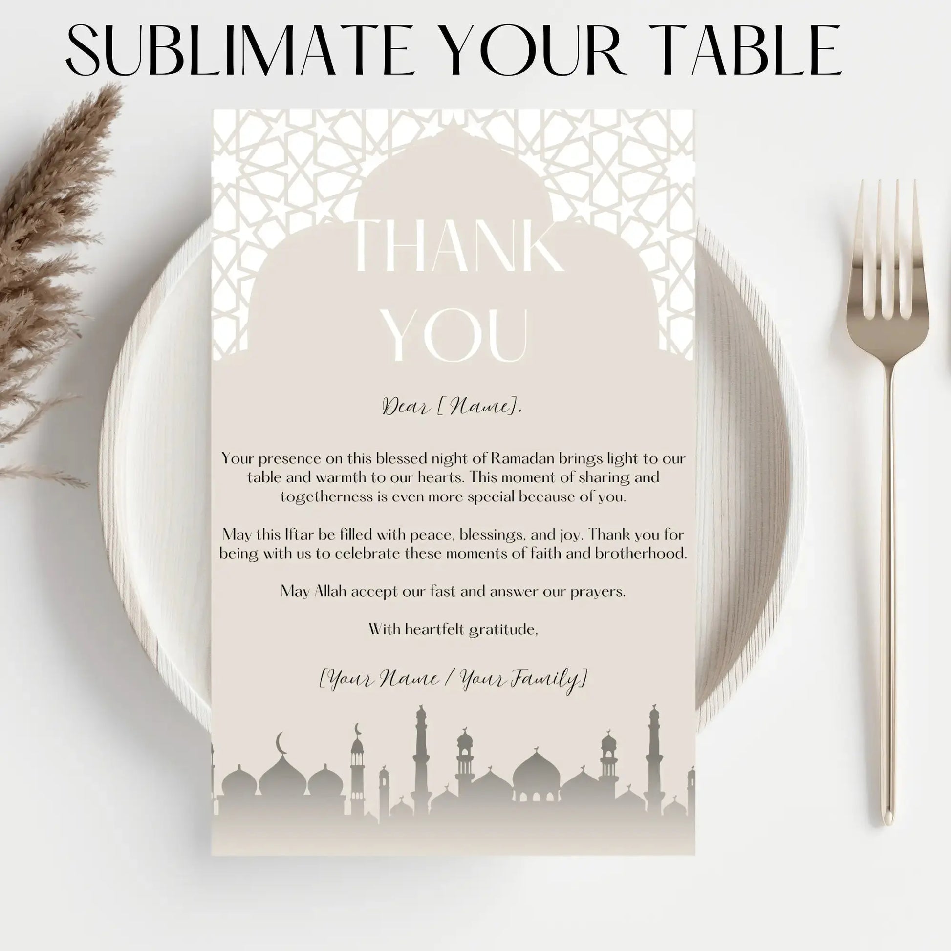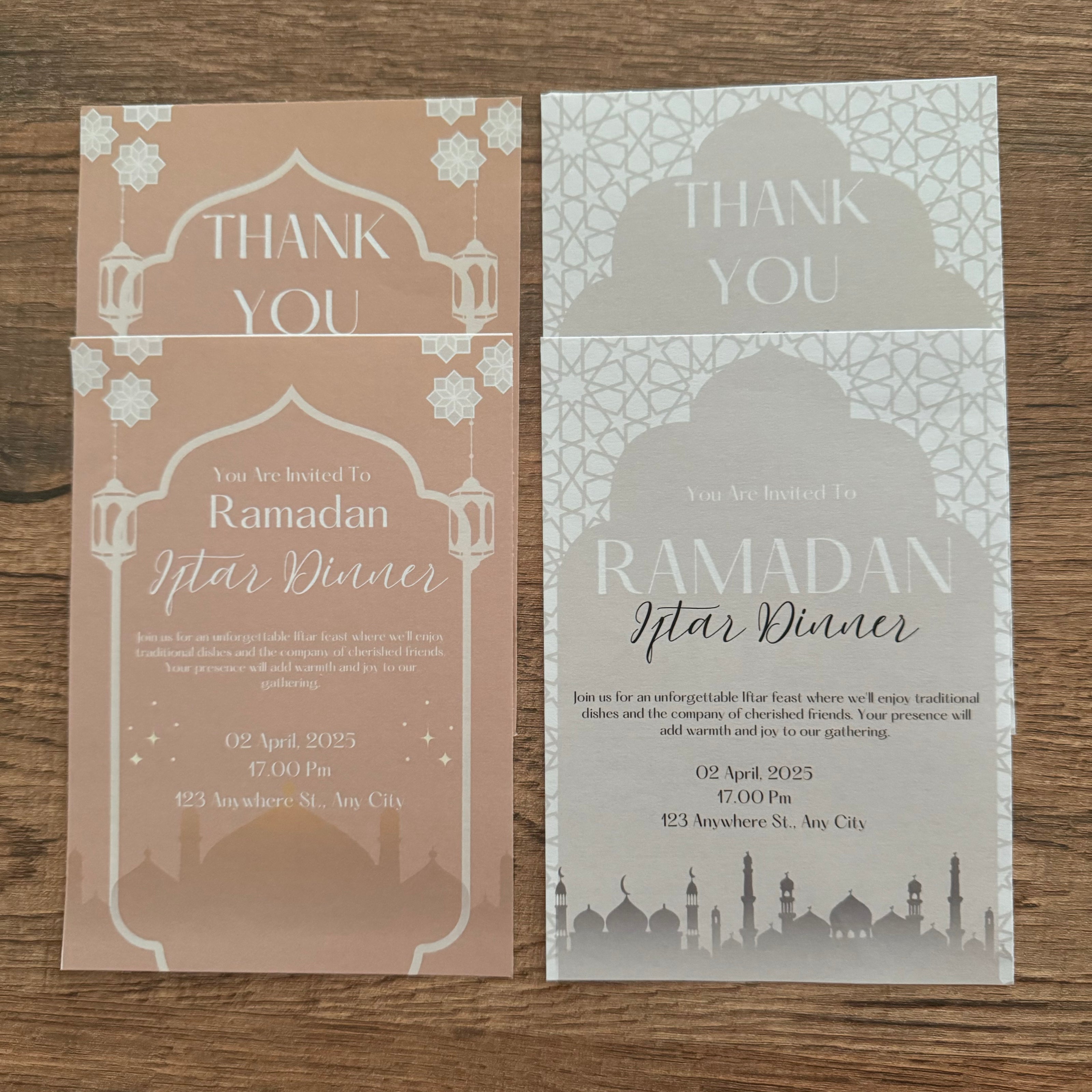 Honorez vos invités avec des invitations magnifiquement conçues et des cartes de remerciement attentionnées, parfaites pour sublimer votre table du Ramadan.
