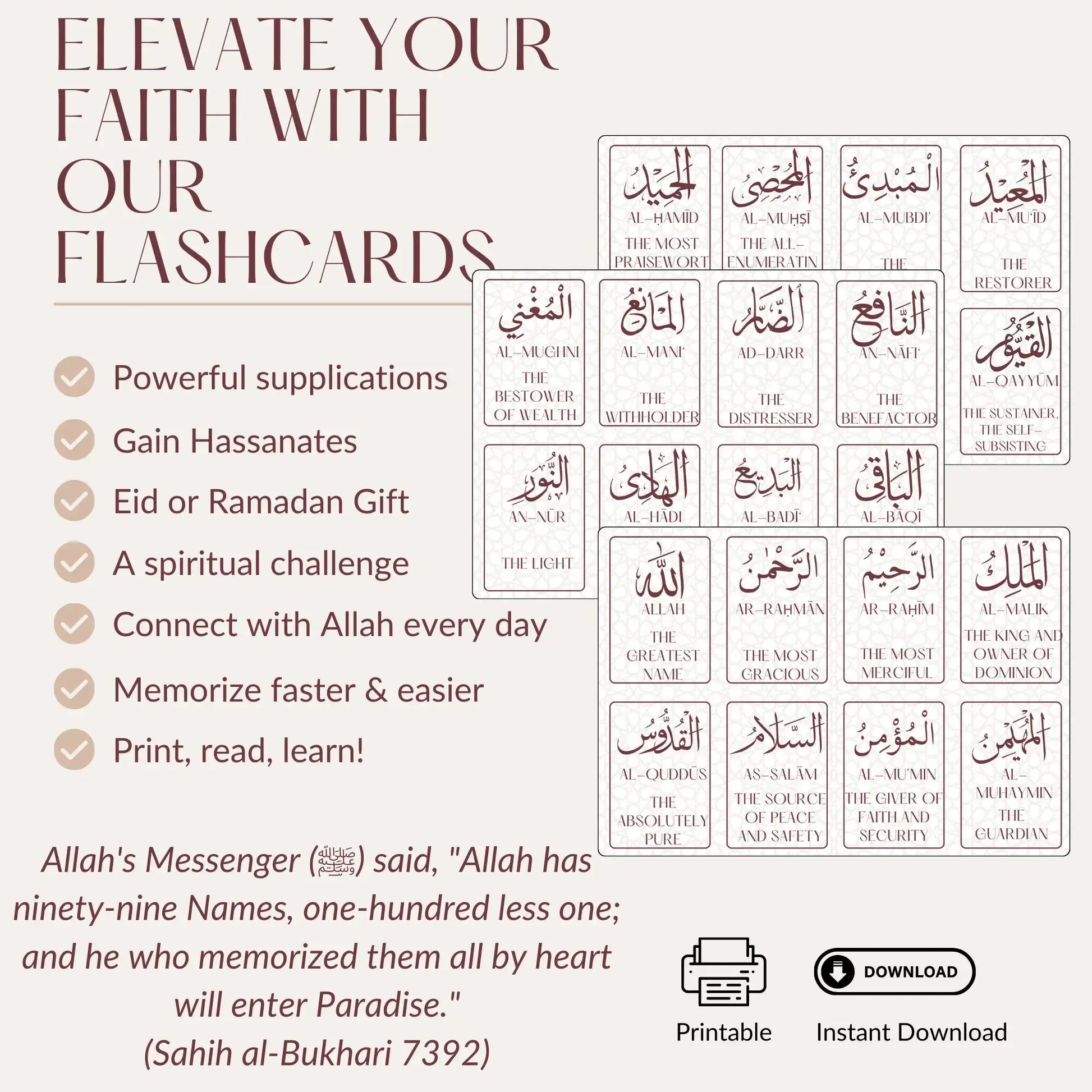 99 Names of Allah Flashcards: Printable Islamic Cards, Imaan Booster, Ramadan/Eid Gift